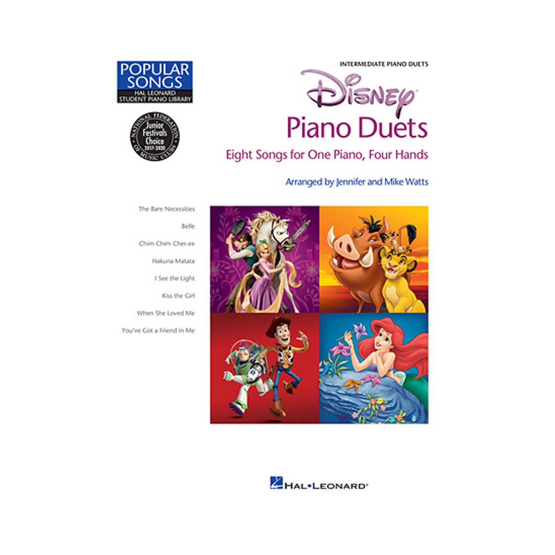 Here are 8 great Disney hits expertly arranged as intermediate duets: The Bare Necessities • Belle • Chim Chim Cher-ee • Hakuna Matata • I See the Light • Kiss the Girl • When She Loved Me • You've Got a Friend in Me.